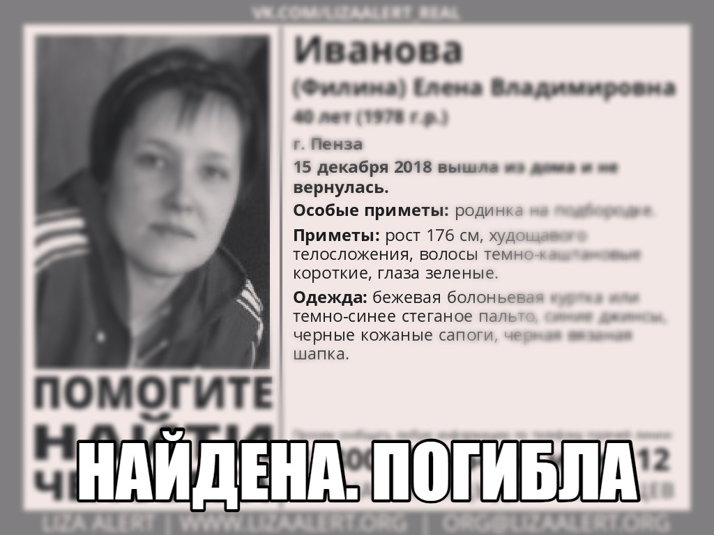 В официальной группе поискового отряда «Лиза Алерт» в соцсети «ВКонтакте» появилась информация о том, что пропавшая еще в декабре 2018 года 40-летняя пензячка Елена Иванова (Филина) погибла.