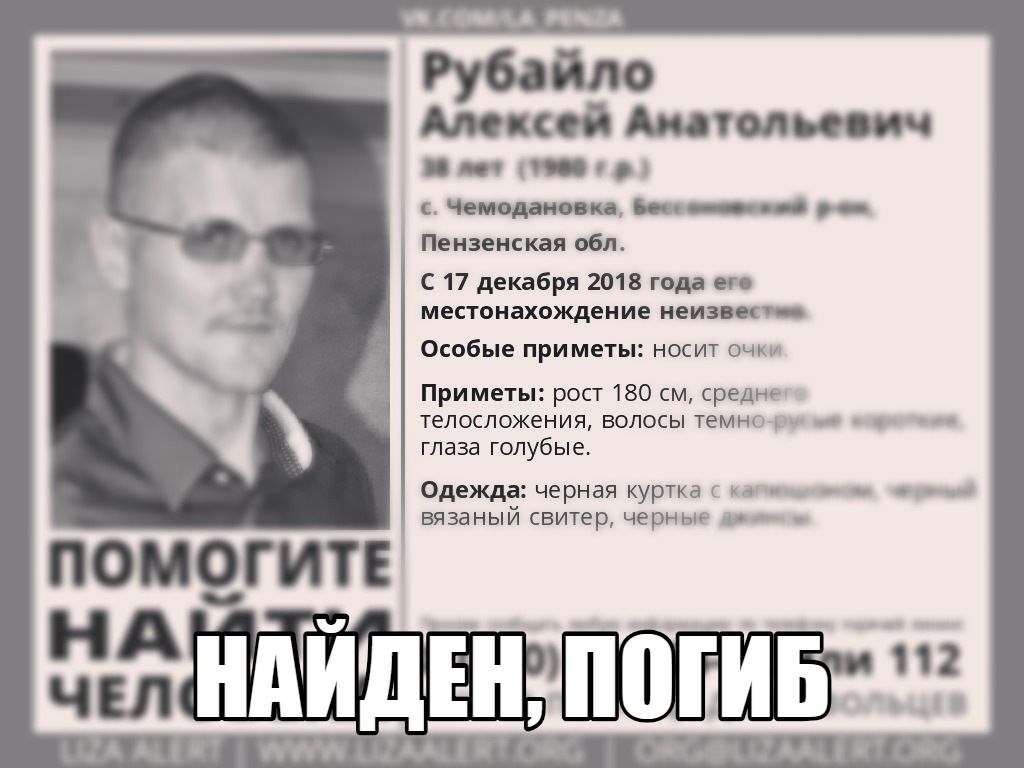 Пропавшего жителя села Чемодановка Бессоновского района Алексея Рубайло нашли мертвым. Об этом появилась информация в официальной группе поискового отряда «Лиза Алерт» в соцсети «ВКонтакте».